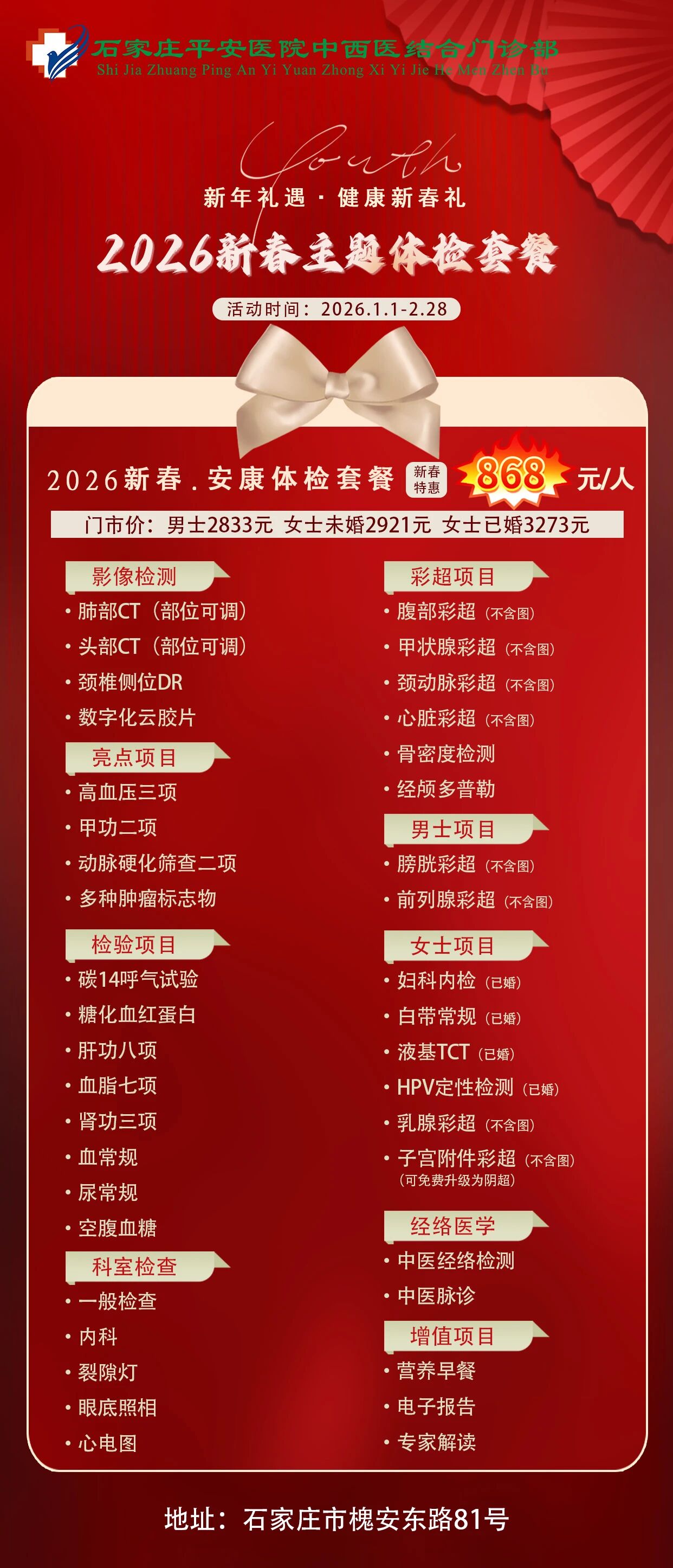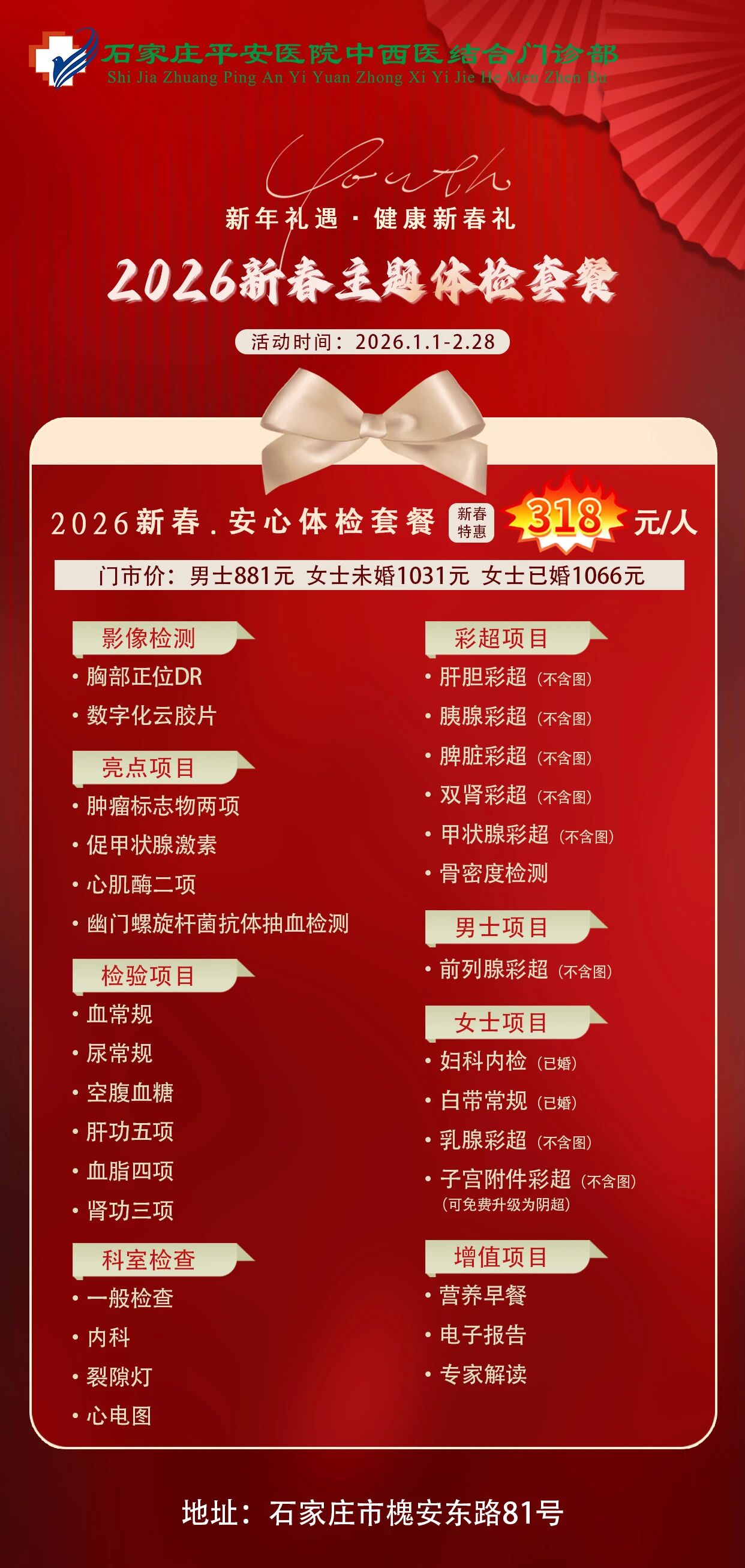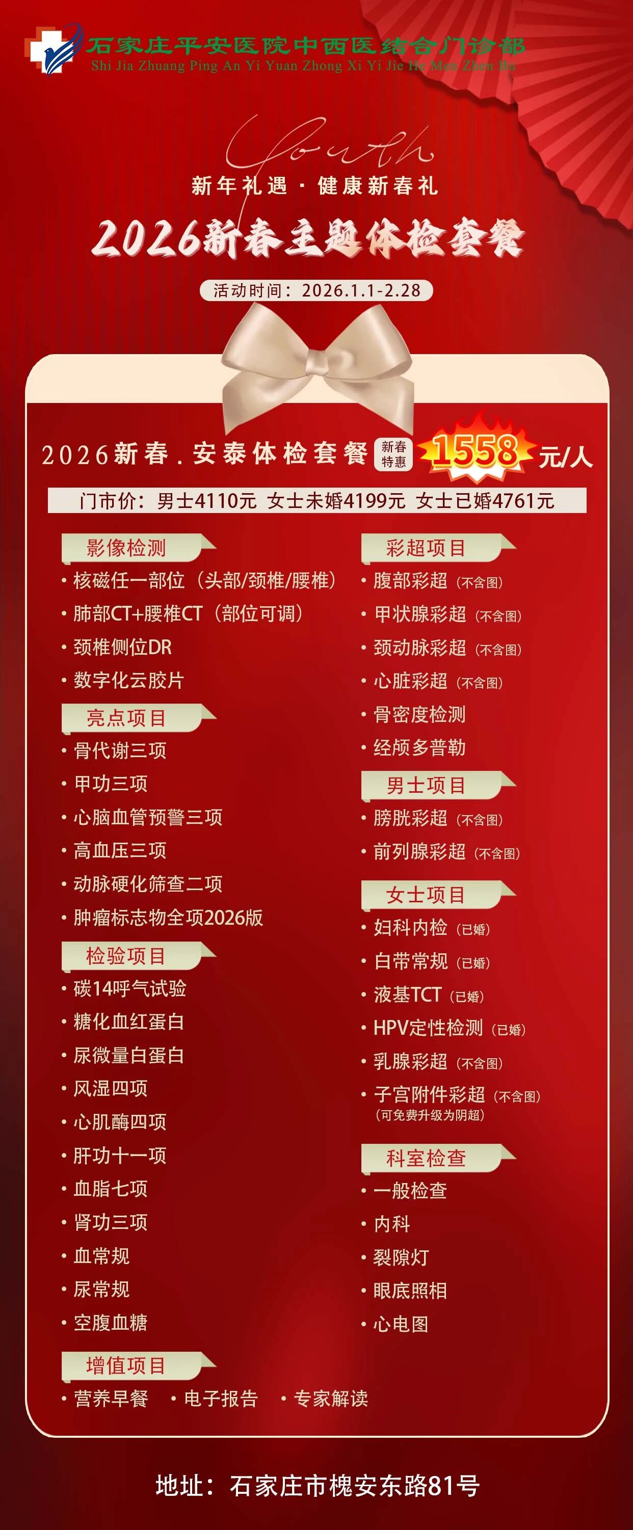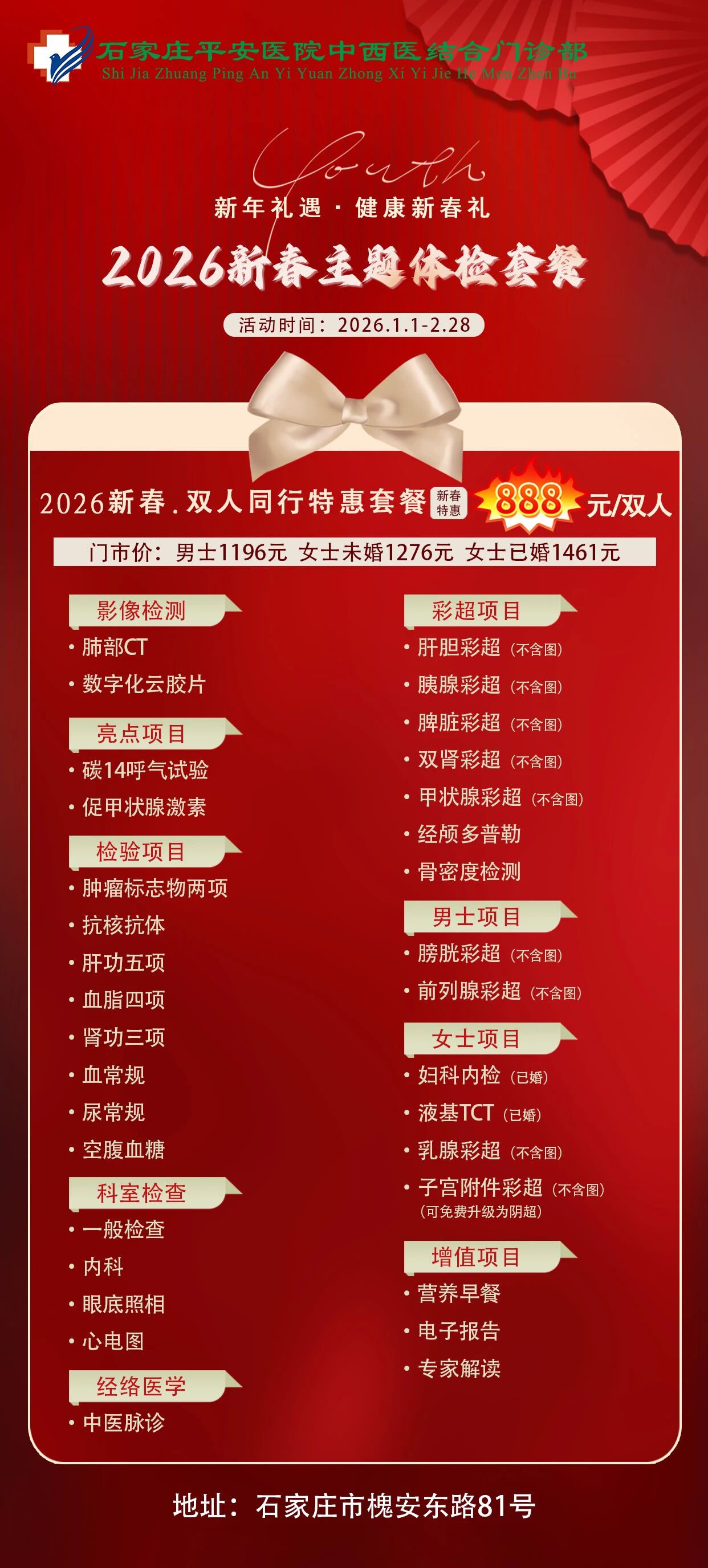 2026新春平安健康体检推出「安心·安享·安康·安泰」四大主题套餐,外加「双人同行」暖心福利,用一份科学、贴心的体检,为全家人的健康保驾护航——毕竟,最好的新年礼物,是彼此都好好的。