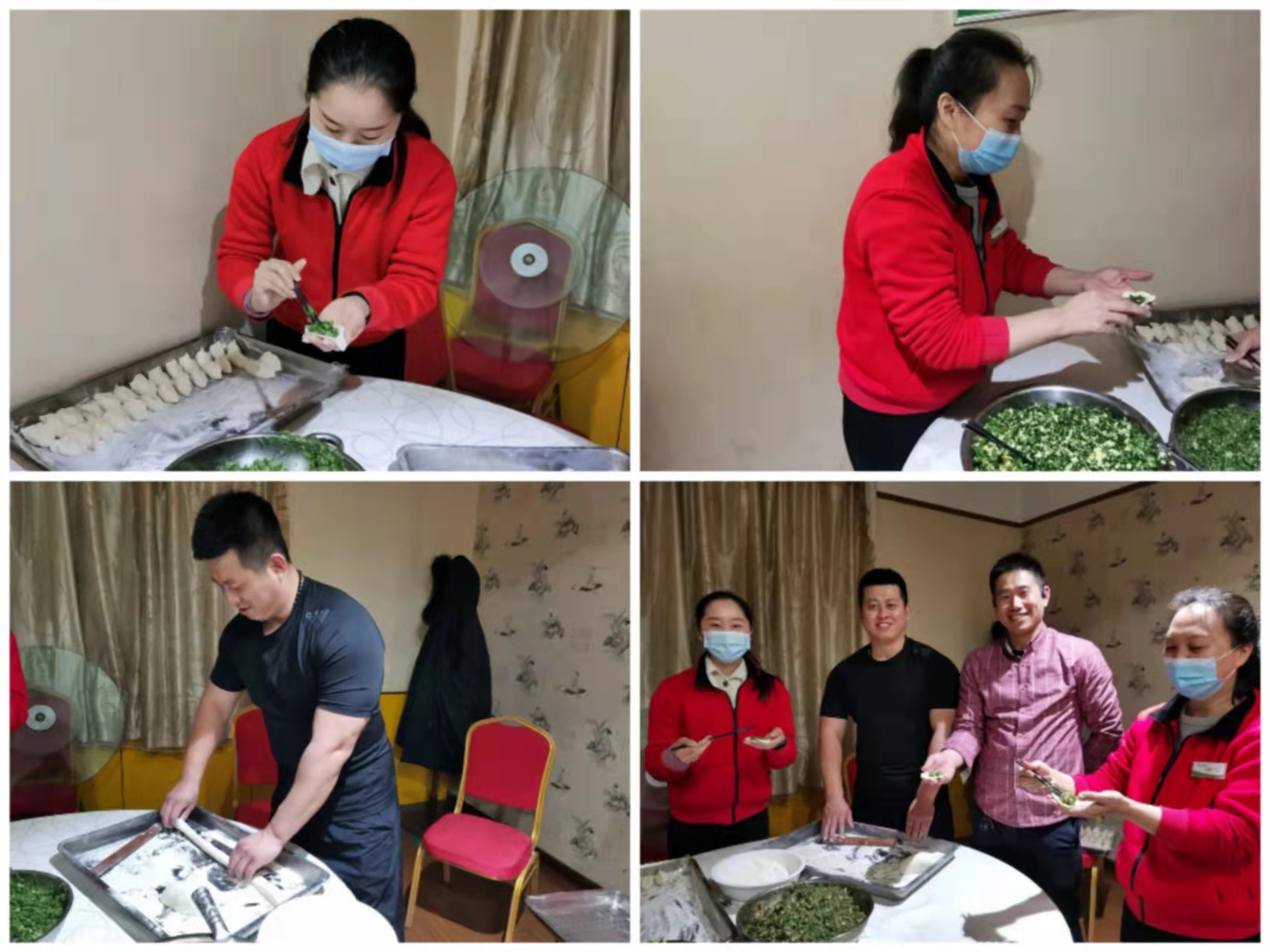 活动由各部门组成,分为“体检奋进组”、中医养生组、“健身达人组”、“销售精英组”、“行政保障组”五组队伍,餐饮部提前准备了包饺子的面粉和肉馅,员工们也积极准备了擀面杖、案板等工具。活动开始后,各组队伍都热情高涨、信心满满的行动了起来。