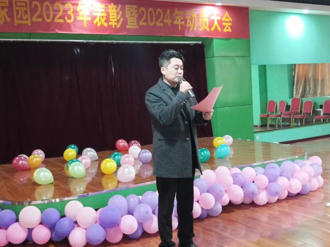 年会伊始河北平安健康家园总经理高朋建致辞。高总带领大家一起回顾了2023年家园取得的丰硕成果与感动瞬间,面对充满机遇和挑战的2024年,高总希望家园人老中青三代全体行动起来,像雄鹰一样翱翔天宇,像蛟龙一样纵横山海。高总强调没有比人更高的山,没有比脚更长的路,行动起来,诗与远方均可至,梦与山巅皆可攀!