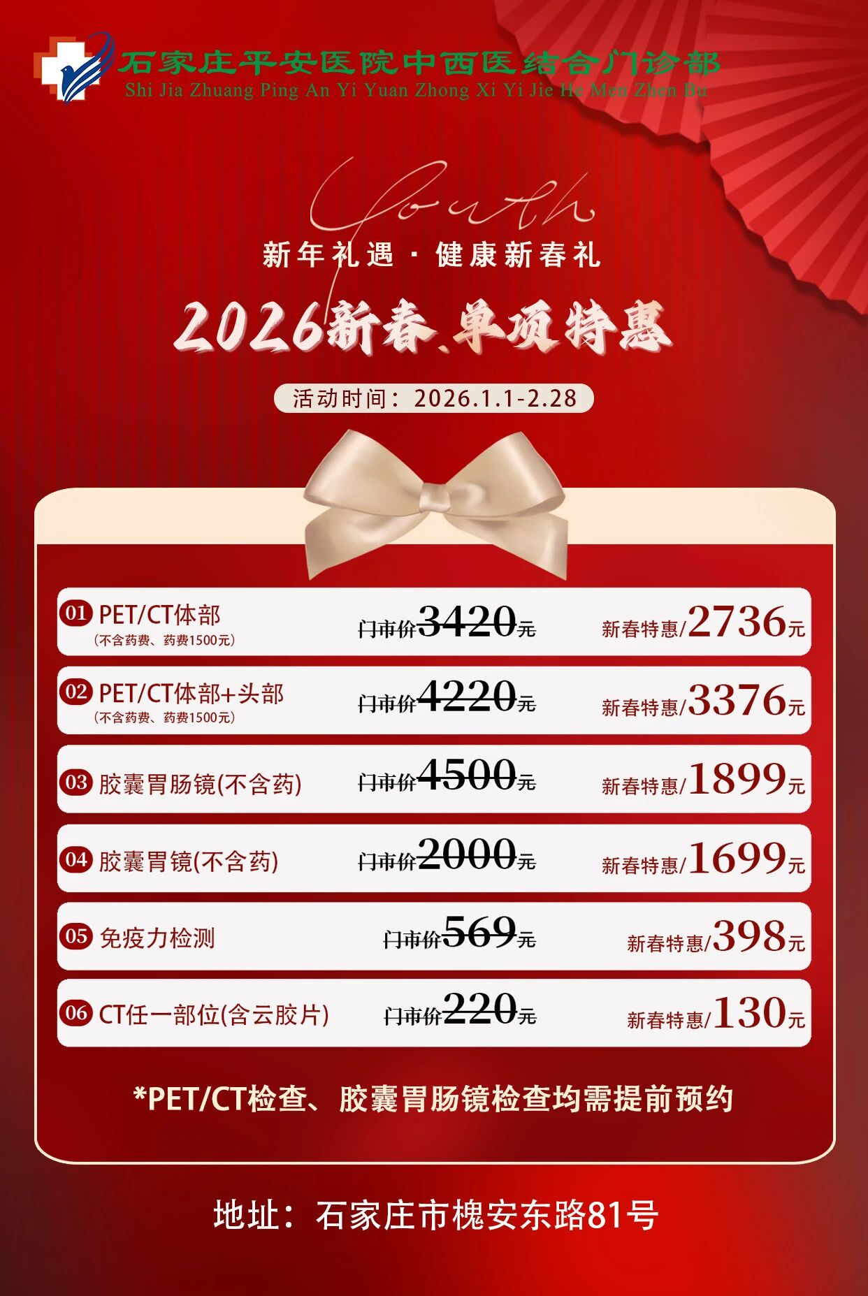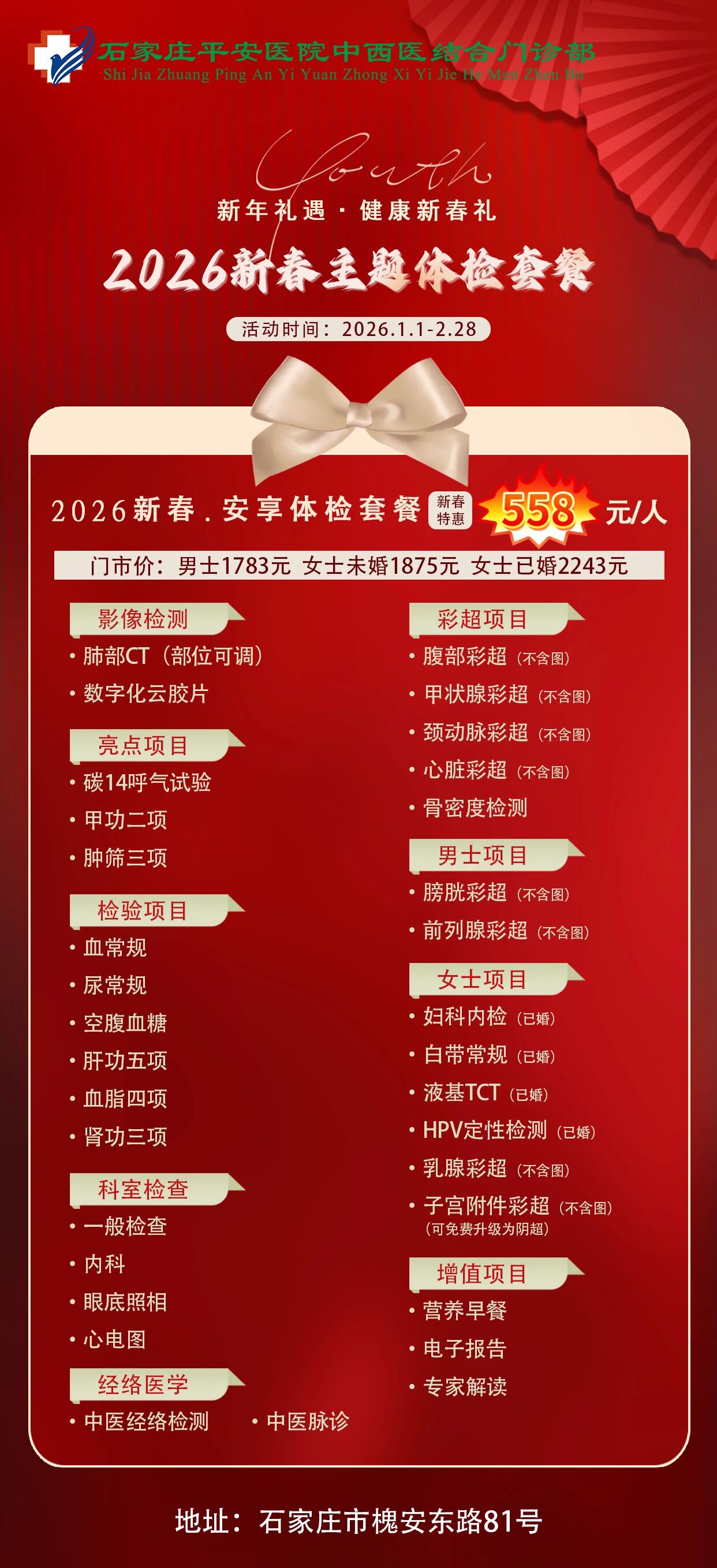 2026新春平安健康体检推出「安心·安享·安康·安泰」四大主题套餐,外加「双人同行」暖心福利,用一份科学、贴心的体检,为全家人的健康保驾护航——毕竟,最好的新年礼物,是彼此都好好的。